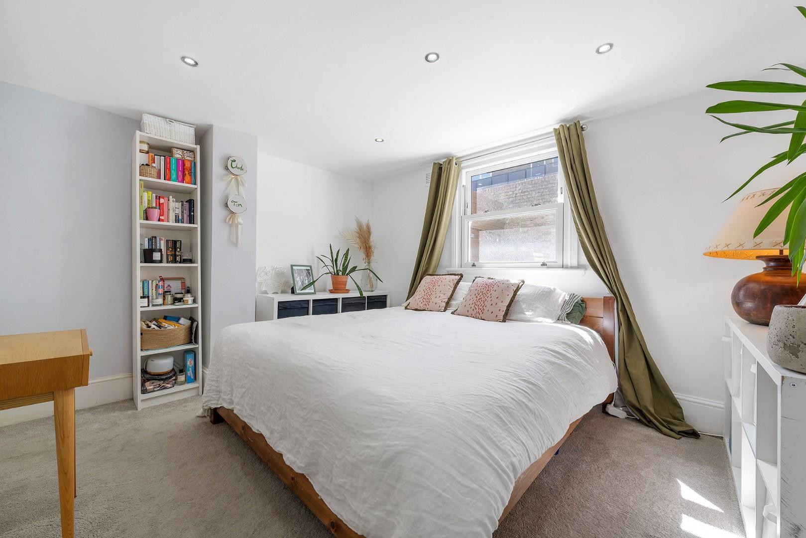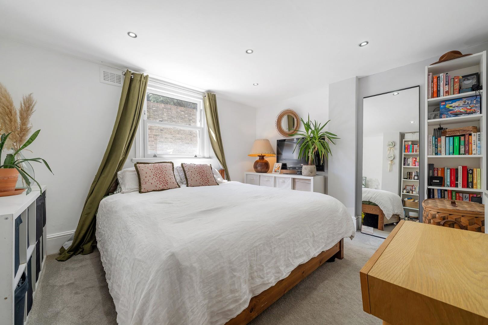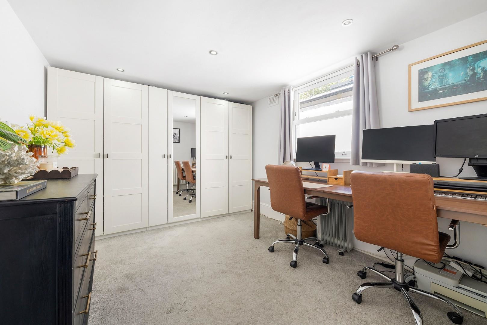To the rear of the property are two well-proportioned double bedrooms, both enjoying a peaceful outlook away from the street. The principal bedroom is particularly tranquil, positioned at the back of the building overlooking the garden and offering a quiet retreat with minimal noise, perfect for restful nights. The second bedroom is equally versatile, overlooking the side return and currently arranged as a home office and guest room, ideal for modern living.