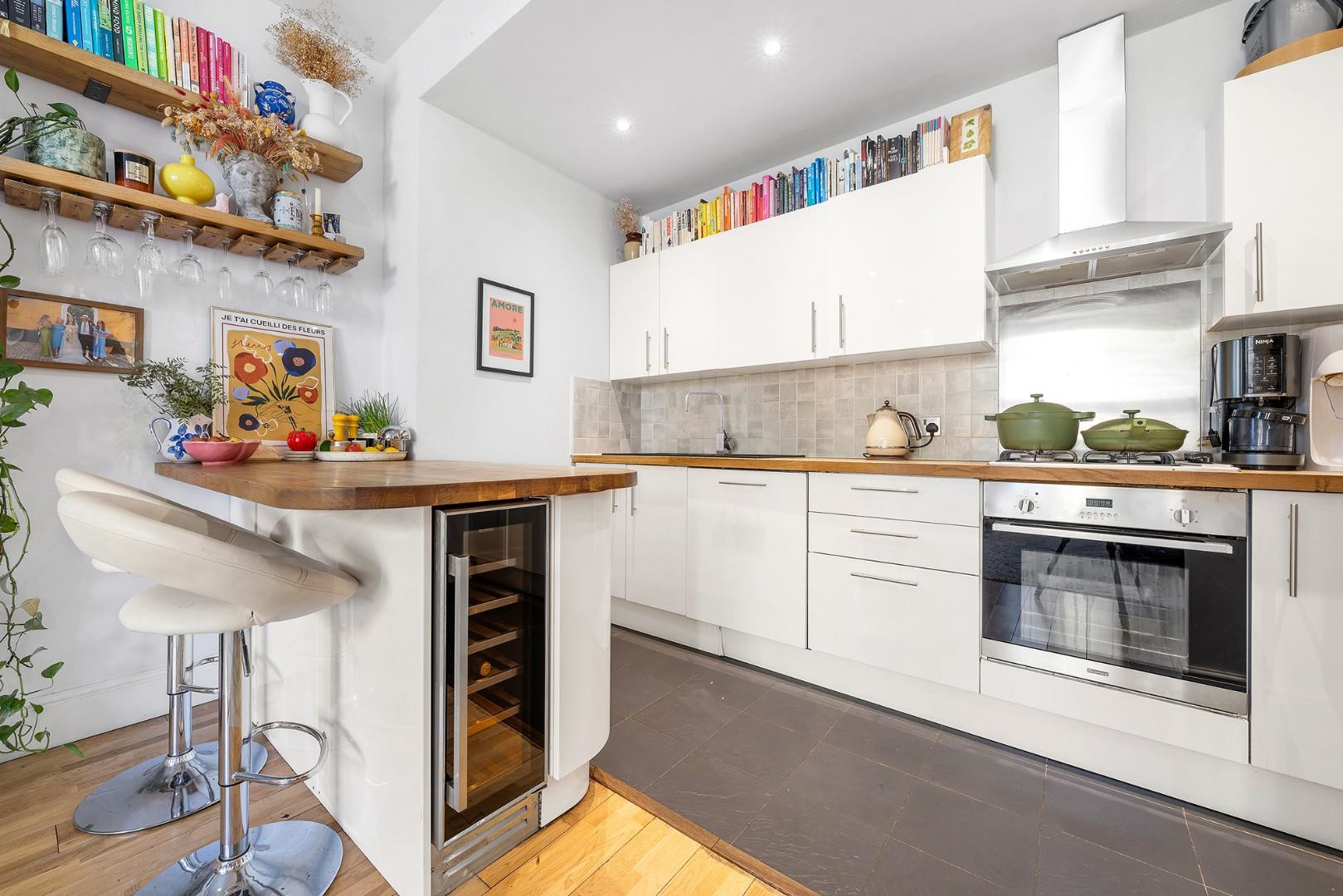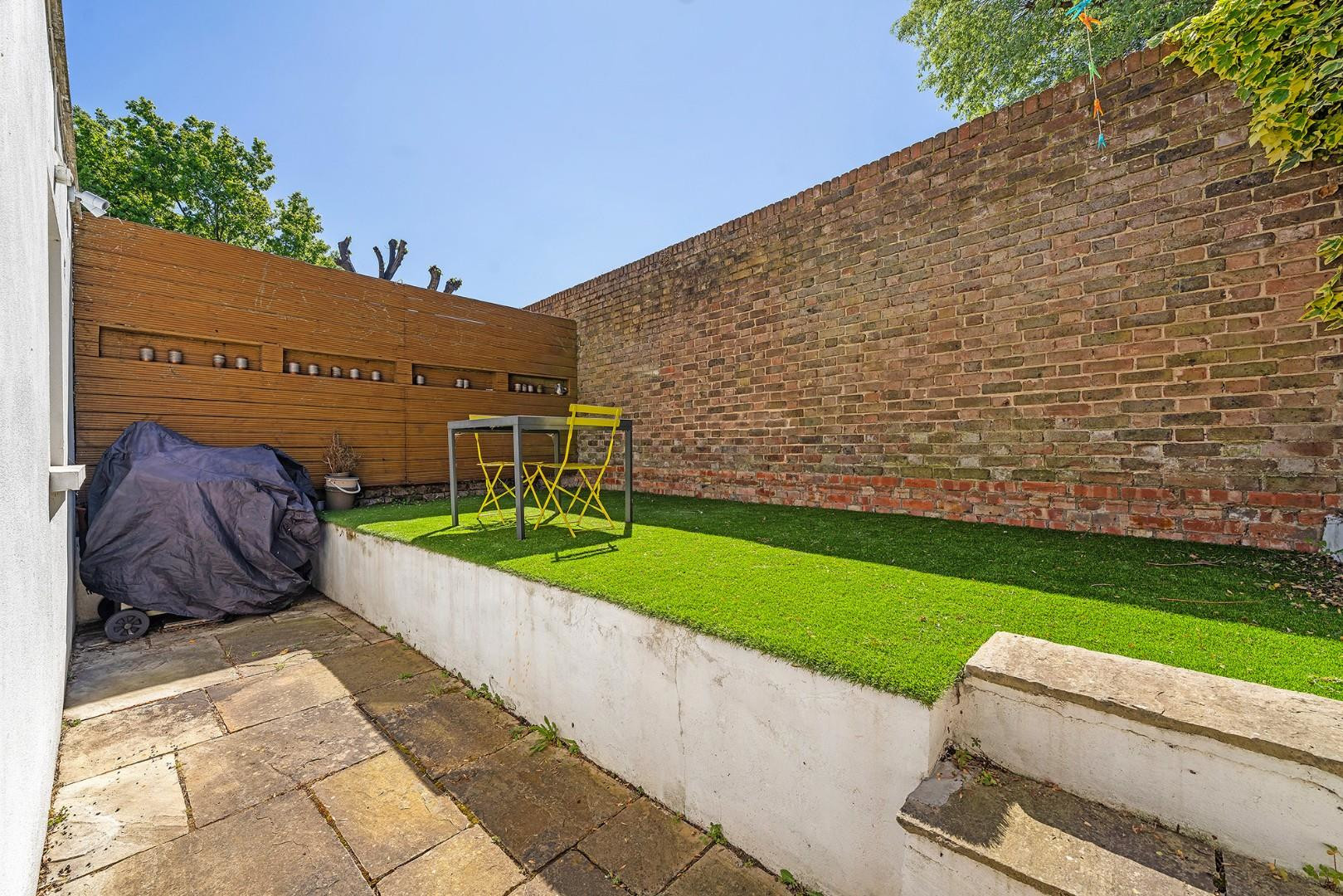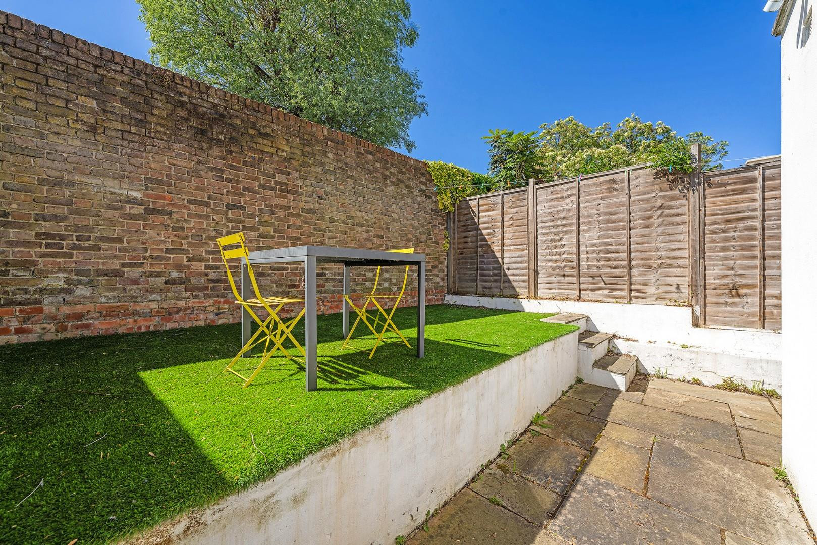 To the rear of the property are two well-proportioned double bedrooms, both enjoying a peaceful outlook away from the street. The principal bedroom is particularly tranquil, positioned at the back of the building overlooking the garden and offering a quiet retreat with minimal noise, perfect for restful nights. The second bedroom is equally versatile, overlooking the side return and currently arranged as a home office and guest room, ideal for modern living.