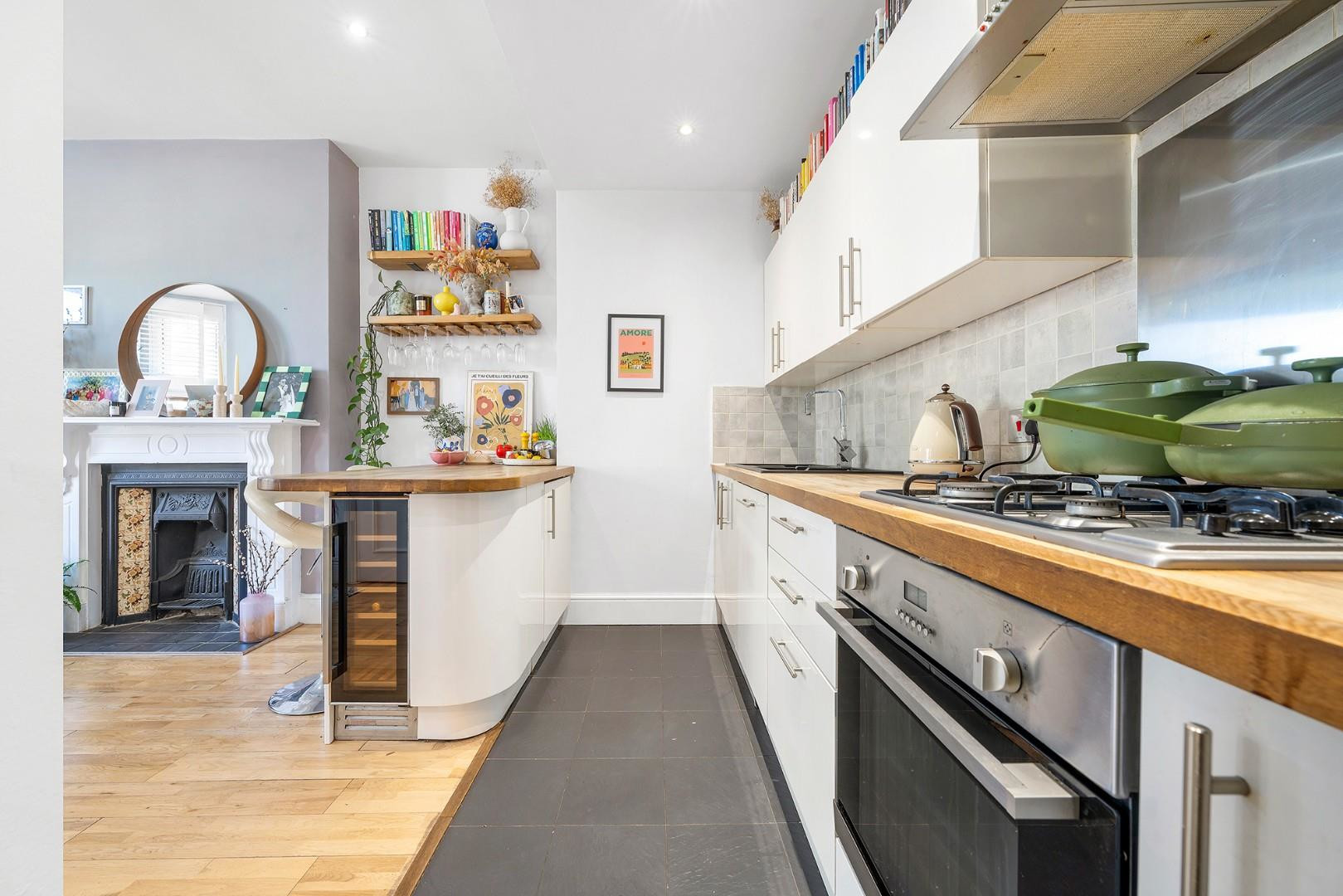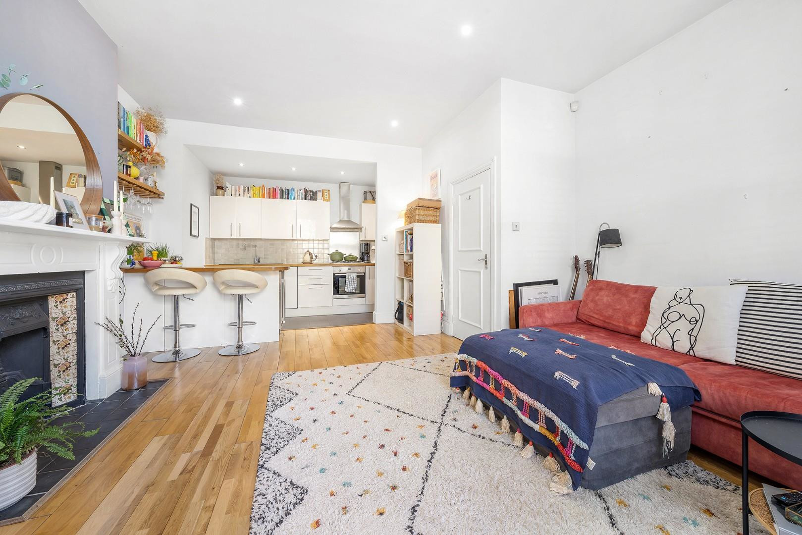 The heart of the home is a bright and inviting open-plan reception and kitchen space to the front of the property. Bathed in natural light from a charming bay window fitted with plantation shutters, this room offers a welcoming atmosphere ideal for both relaxing and entertaining, with tasteful décor and a characterful fireplace which forms a striking focal point. The kitchen is neatly arranged to one side, featuring sleek white cabinetry, ample worktop space and integrated appliances, with a sociable breakfast bar that creates a seamless connection between cooking and living areas.