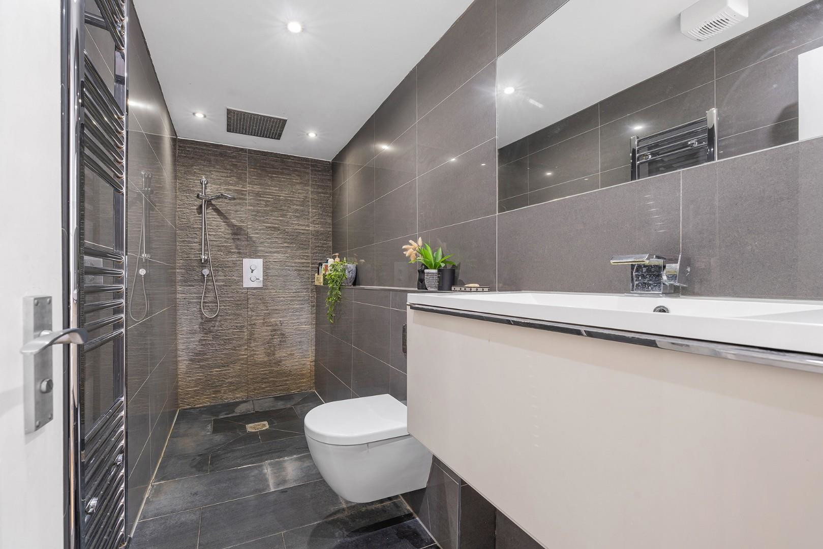 A stylish and contemporary bathroom sits centrally within the home, finished with a walk-in rainfall shower, creating a sleek and calming space.